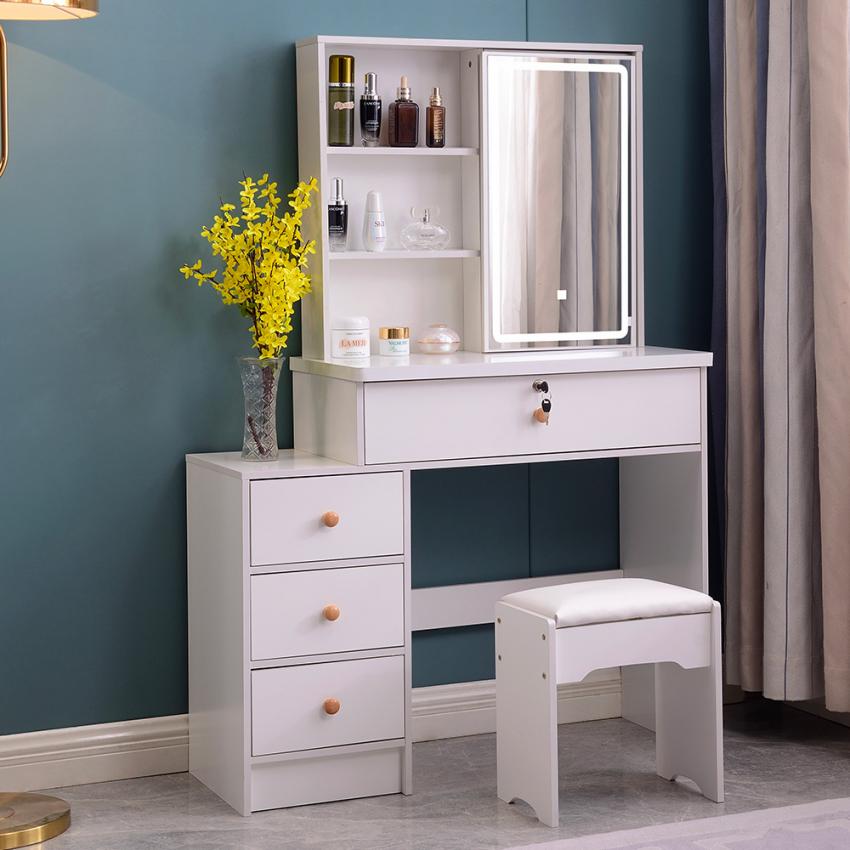 Dieser Schminktisch bietet Ihnen mit vier Schubladen in unterschiedlichen Größen ausreichend Stauraum. Die großen Schubladen eignen sich hervorragend für Make-up-Werkzeuge wie Haartrockner und Lockenwickler, während die kleineren Schubladen ideal für Hautpflegeprodukte sind.